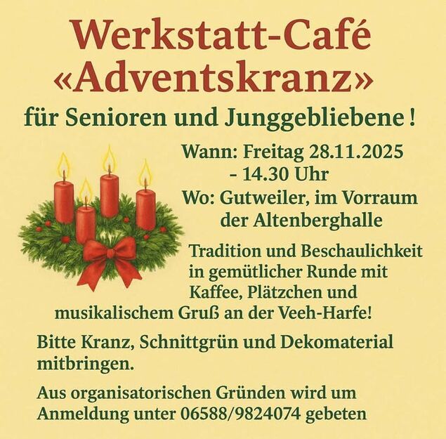Werkstatt-Café "Adventskranz" für Senioren und Junggelbliebene.Weitere Informationen unter Veranstaltungen & Events.